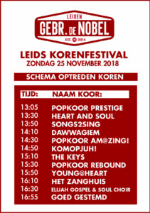 Leiden en omstreken kent een groot aantal koren in verschillende genres. Van kinderen tot volwassenen, van swingende pop koren tot prachtige jazz. Daarom brengt Gebr. de Nobel 15 koren samen tijdens het Leids Korenfestival. De koren krijgen elk 15 minuten de tijd om hun repertoire ten gehore te brengen aan het publiek. Niet als competitie maar om zichzelf te presenteren.